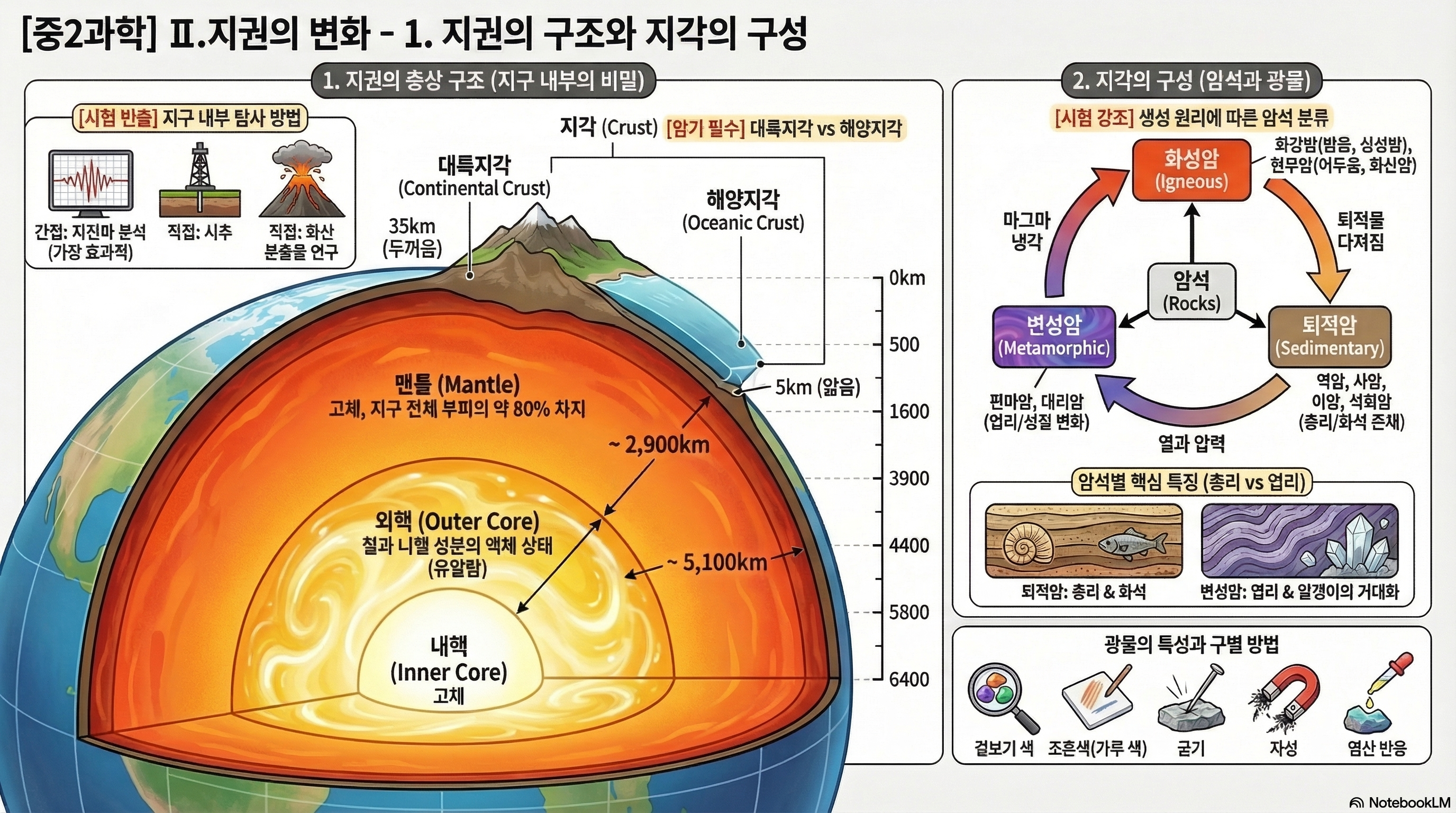 - 공통 성분: 외핵과 내핵 모두 철과 니켈로 이루어져 밀도가 매우 크다는 공통점을 기억하세요.